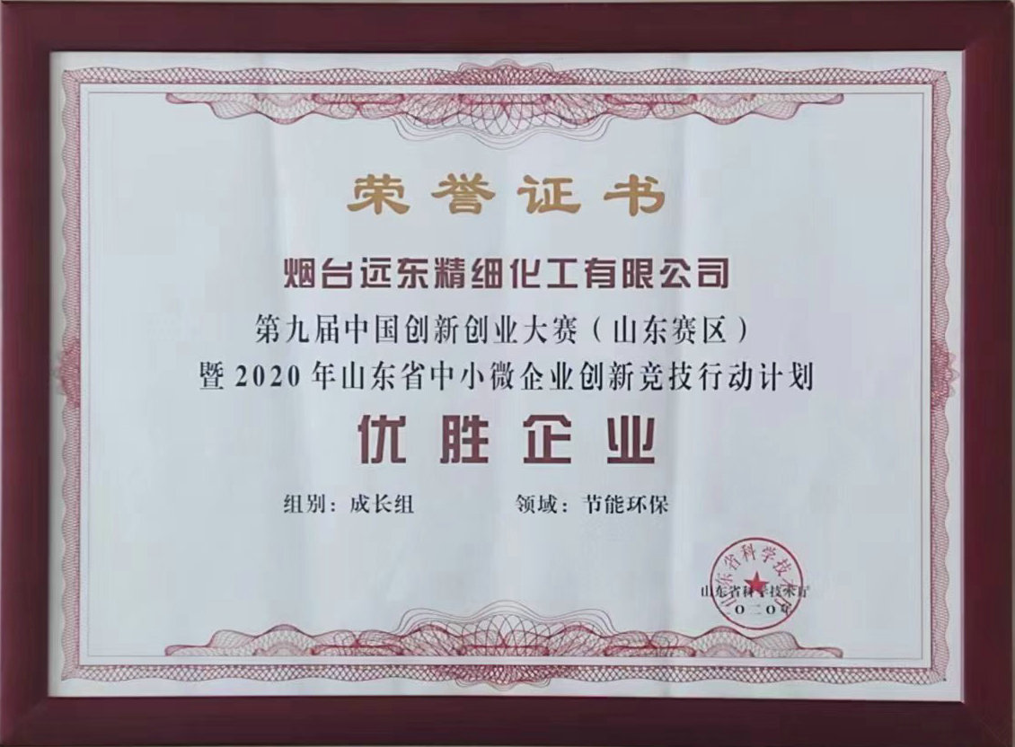 《中共山東省委山東省人民政府關(guān)于推進新舊動能轉(zhuǎn)換重大工程的實施意見》和《中共山東省委山東省人民政府關(guān)于深化科技體制改革加快創(chuàng)新發(fā)展的實施意見》要求,山東省科技廳組織實施了第九屆中國創(chuàng)新創(chuàng)業(yè)大賽(山東賽區(qū))暨2020年山東省中小微企業(yè)創(chuàng)新競技行動計劃,煙臺遠東精細化工有限公司榮獲優(yōu)勝企業(yè)。