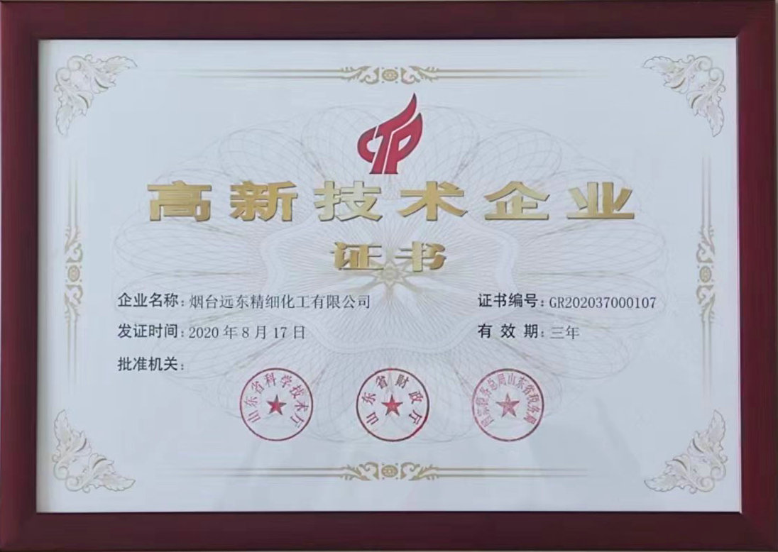 煙臺遠東精細化工有限公司收到了由山東省科學(xué)技術(shù)廳、山東省財政廳、國家稅務(wù)總局山東省稅務(wù)局聯(lián)合批準(zhǔn)的“高新技術(shù)企業(yè)”證書。國家高新技術(shù)企業(yè)認定具有嚴(yán)格的測評和審批流程,企業(yè)必須滿足擁有核心技術(shù)、自主知識產(chǎn)權(quán)、產(chǎn)品服務(wù)于高新技術(shù)領(lǐng)域、企業(yè)科技人才占比等多項指標(biāo)。